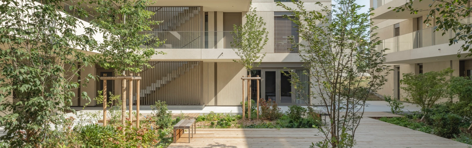 Au cœur de chaque îlot, un patio végétalisé assure une continuité avec les espaces naturels du parc, créant un dialogue constant entre l’intérieur et l’extérieur. De larges balcons, terrasses et baies vitrées maximisent l’apport en lumière naturelle et favorisent une connexion directe avec l’environnement paysager. Les toitures plates, recouvertes de gravier, renforcent la sobriété de la silhouette architecturale.