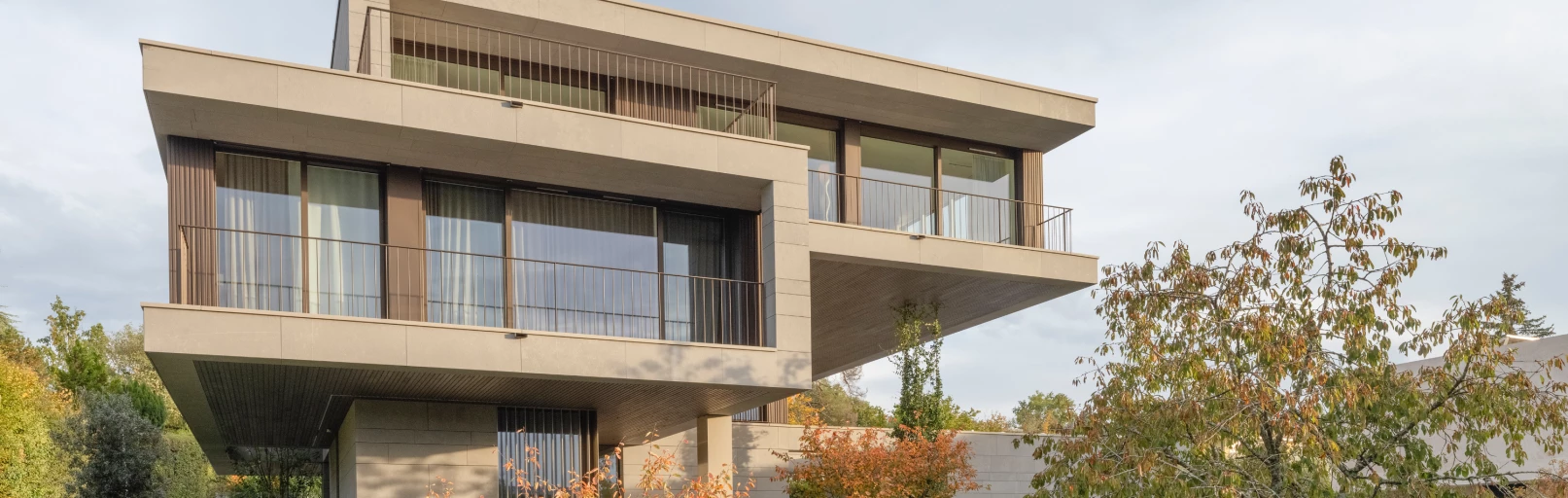 L’usage de matériaux durables et nécessitant peu d’entretien, notamment la pierre et le métal plié, confère au projet une matérialité minérale, jouant sur l’alternance entre opacité et transparence. Ce choix architectural renforce l’expressivité du bâtiment par un travail subtil sur les ombres et les textures. L’élévation côté lac, atteignant 10 mètres, marque une transition verticale forte entre le bâti et le terrain en contrebas, où s’intègrent un couloir de nage et un pool house, épousant la topographie du site.